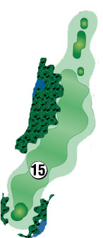 A fade off the mounds in the distance is required on this long and difficult hole. A fairway wood or long iron is required to hit a large green tucked into the trees. With a swale on the right and left, and a tilted green, par here feels like a birdie. |